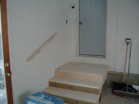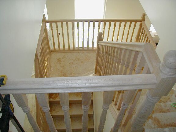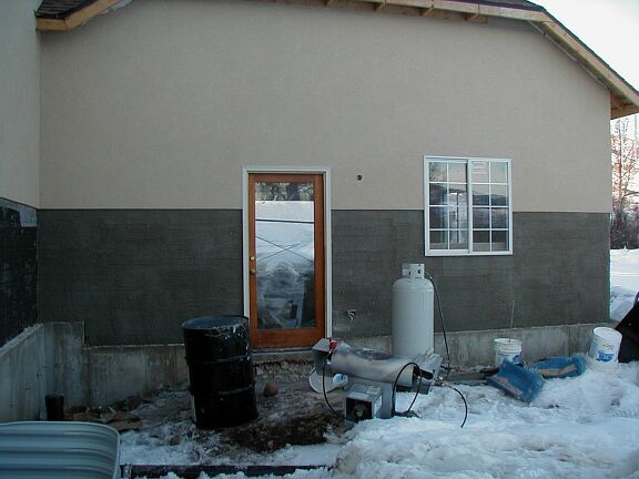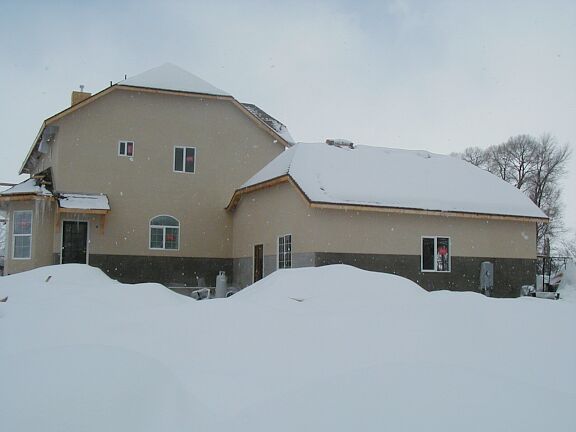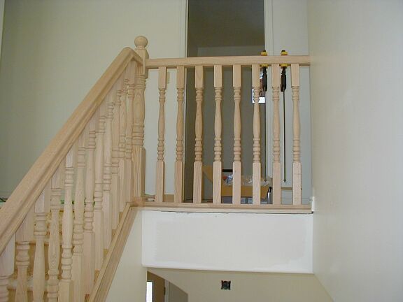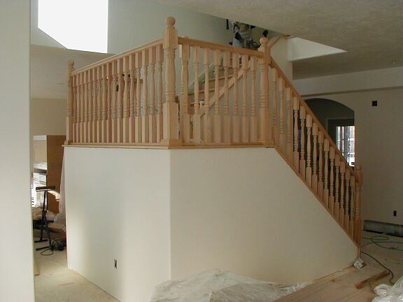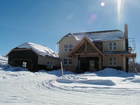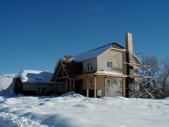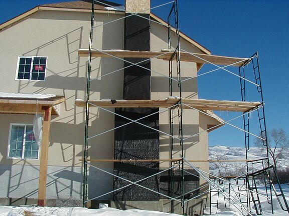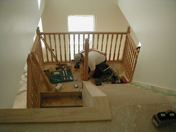 Monday, February 4th Travis finished the outside railing around the bottom half of the stairs, and started on the inside railing that goes to the top. The stucco guys got a little more tar paper on the front and on the chimney. The phone guy came back and hooked up the phone. I installed some light fixtures and smoke detectors. |
