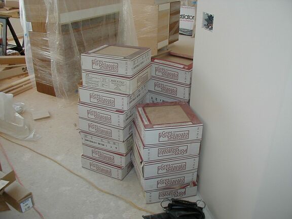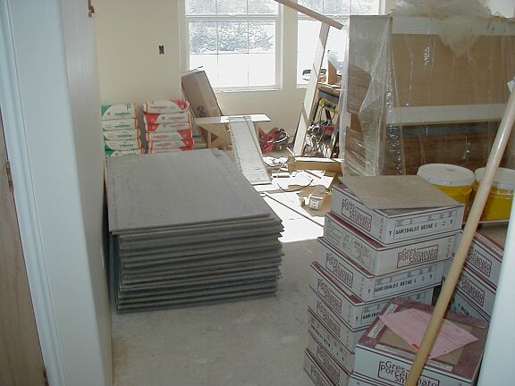 Saturday, February 9th The cabinet guy came and installed all the cabinets in the kitchen so we could start tiling. Edith and I went down to Home Depot and bought all the tile backer, mortar, tools, etc. for the tiling job. My dad and I unloaded everything (a few thousand pounds worth), and installed some of the backer board in the mudroom. |
