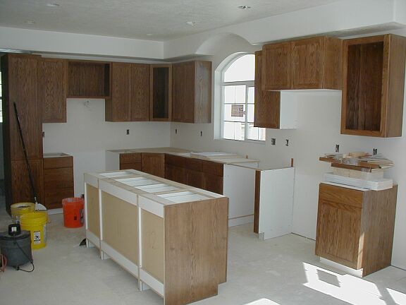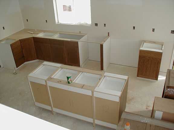 Thursday, February 7th The stucco guys did the scratch coat on the east of the house and the garage. The cabinet guy installed the island. |